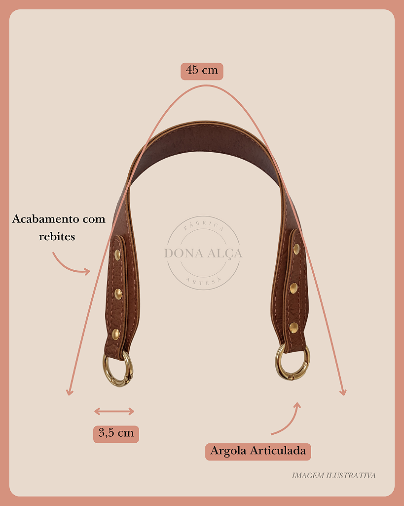 O destaque desta alça são as argolas articuladas metálicas nas extremidades, que facilitam a fixação e proporcionam um toque de elegância e modernidade ao design da bolsa.