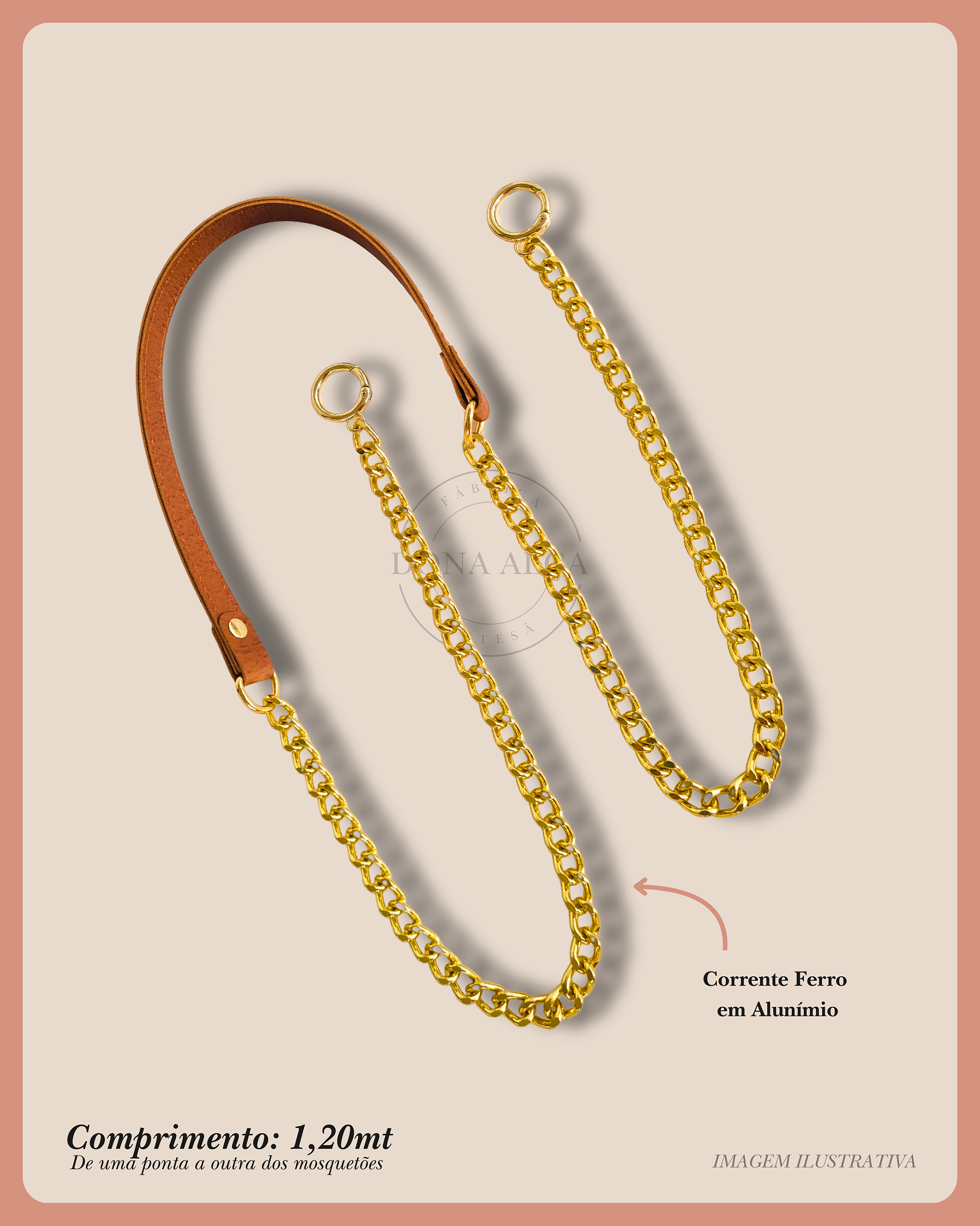 A Alça com corrente é uma combinação de material sintético com correntes em alumínio, trazendo um contraste delicado do sintético e o visual mais robusto da corrente metálica, com um visual moderno, trazendo elegancia e sofisticação ao acessório, além de serem duravéis e funcionais, Pode ser usada no ombro ou como tiracolo.