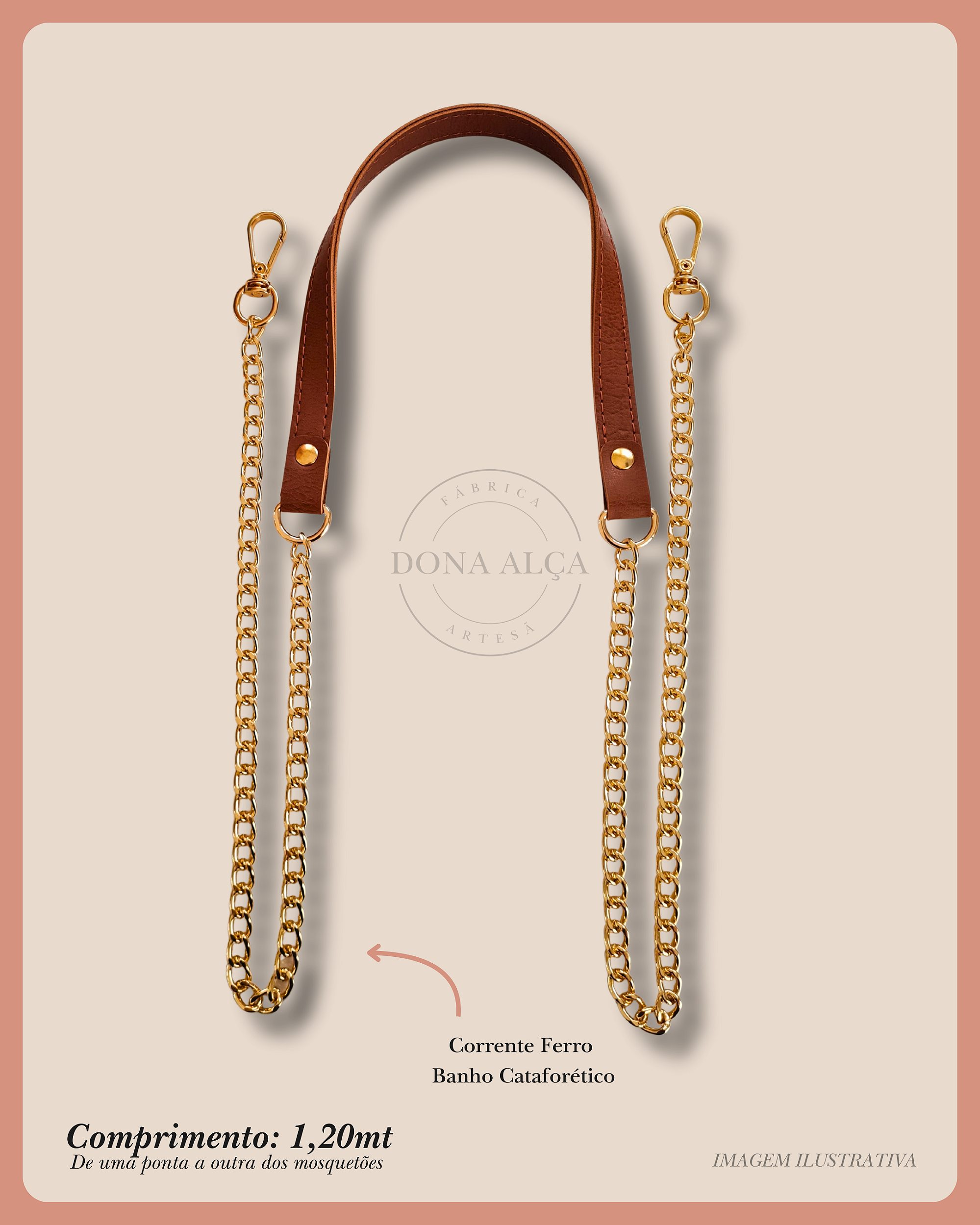 A Alça com corrente é uma combinação de material sintético com correntes em ferro, trazendo um contraste delicado do sintético e o visual mais robusto da corrente metálica, com um visual moderno, trazendo elegancia e sofisticação ao acessório, além de serem duravéis e funcionais, Pode ser usada no ombro ou como tiracolo.